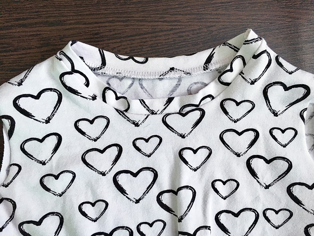 5.     Začistíme priekrčník prúžkom materiálu. Prúžok by mal byť približne o 5-7 cm kratší ako obvod priekrčníka. Vystrihnutý prúžok zložíme na polovicu a prežehlíme. Takto pripravený prúžok látky priložíme LS k LS šiat, našpendlíme, príp. nastehujeme a prišijeme overlockom alebo cik-cakom. Nakoniec prežehlíme.