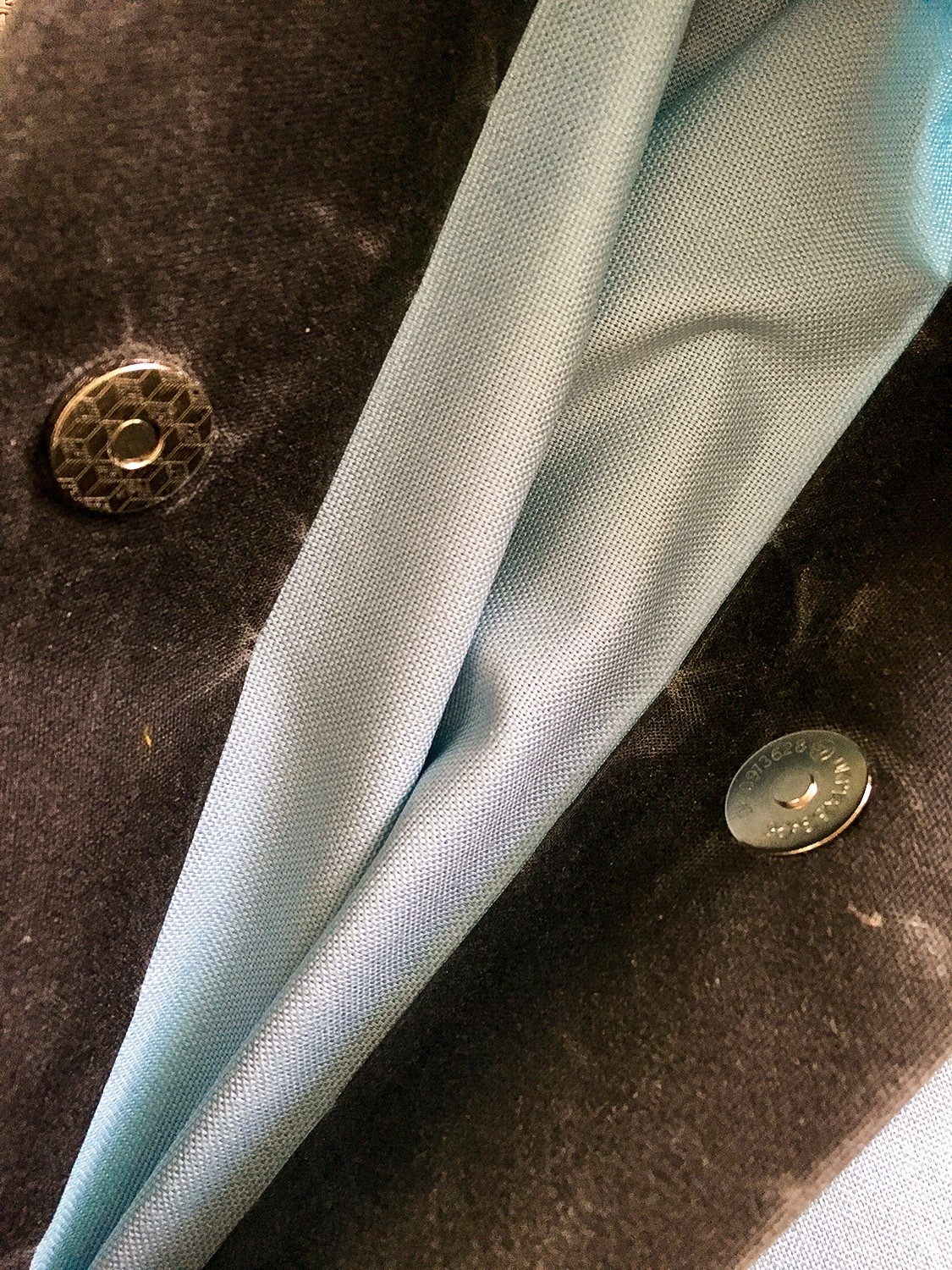 9. Magnetické zapínanie pripevníme do stredu vrchnej časti 5cm od horného okraja. Časť pod zapínaním môžeme spevniť kúskom látky.